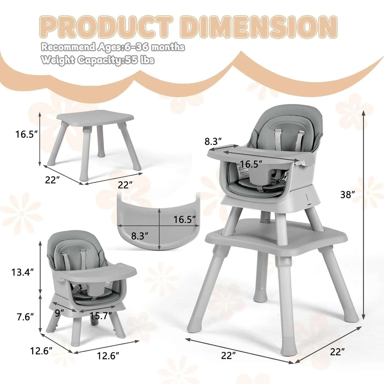 High Chair – 8-in-1 convertible design that transitions from infant high chair to toddler seating.
